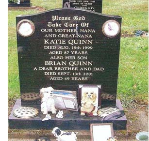 BRIAN QUINN was born at 20 York Street on Wednesday 5th March 1952, being baptised at St. Anne's R. C. Church on 3rd April that year. In 1955, his family came to County Durham and in 1959, Brian moved to Great Lumley. In 1976, he moved to Chester-le-street. From 1987 until 1989, Brian was living at 26 Ruskin Avenue in Pelton Fell, and on 12th October 1990, married Linda Cook at 7 Thorneyholme Terrace in Stanley. They separated around 1996, later divorcing, and following this, Brian went to live with his mother. From his marriage, there were two sons named David John Brian Quinn (1991) and Barry Gordon James Quinn (1993). Since 21st April 1997, Brian had lived at 44 Eighth Avenue, Chester-le-street, and it was here, on 13th September 2001 that he died. Two further addresses are recorded for him - in 1995 to 1996, he lived at 31 Sixth Avenue and also, he spent time at 45 the Avenue. Brian was buried in Ropery Lane Cemetery in Chester-le-street in the same grave as his mother.