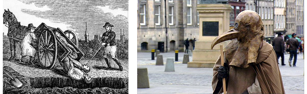 The 16th Century sweeping agricultural landscape of Gateshead had gave way to the coal fields that eventually brought prosperity to the whole of the Tyne and Wear region. The area economy in the nearby fortress town of Newcastle upon Tyne, at the beginning of the 17th Century was based on coal mining, from the River Tyne as it had been since the 13th Century. Ship building here began from adl294, and in the middle ages the export was wool, hides, grindstones and lead. In ad 1530 a royal act restricted all shipments of coal from Tyneside to Newcastle Quayside, giving a monopoly in the coal trade to a cartel of Newcastle burgesses known as the Hostmen. The phrase ‘taking coals to Newcastle’ was recorded first in 1538. During the Elizabethan and Stuart times, plagues, witch trials and fires were common-place, indeed, in July 1597, plague hit Newcastle upon Tyne, and then again in 1635. The death rate for May - December 1636 is reputed to be the fourth biggest plague deaths recorded in England, when almost a third of a probable 20,000 population in Newcastle had died through the disease which had spread from nearby North Shields the previous year. The images below show the similar scenes that were viewed in Newcastle in the 1590s and the 1630s, the picture on the left depicting a mass grave burial of plague victims, while on the right, a picture of a plague Doctor, who would wear the costume when attempting to ward off the plague.